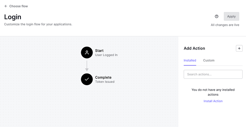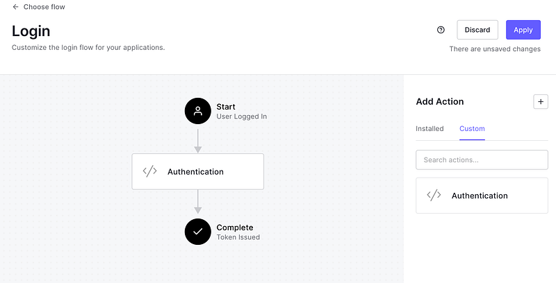3. Click on Save Draft followed by Deploy. Now go back to the flow and click on the Custom tab towards the right and you will be able to drag and drop the Authentication Action into the flow. Click on Apply and the new flow will be integrated into your Application.