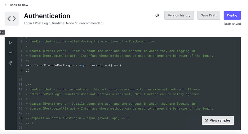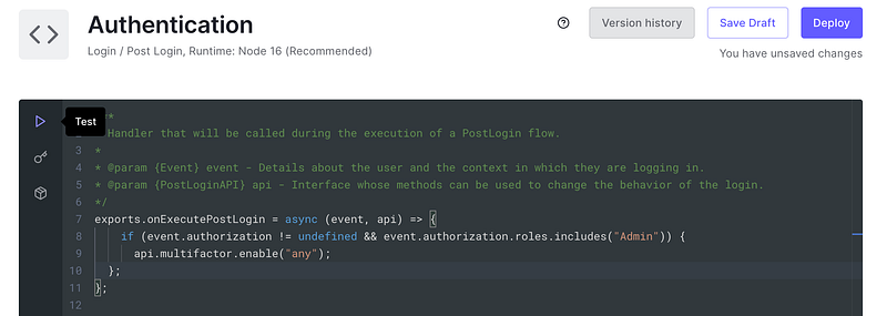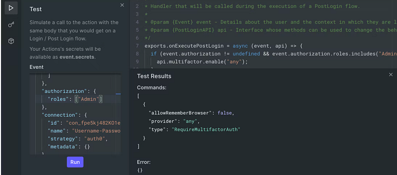 What this simply does is verify if the user has an Admin role and if in case it does, asks the User to go through MFA. On the left side of the code editor, you can see a play button that will emulate a testing environment for your action. You will find the event object in which you can test the actions flow by adding Admin to the authorization.roles array.