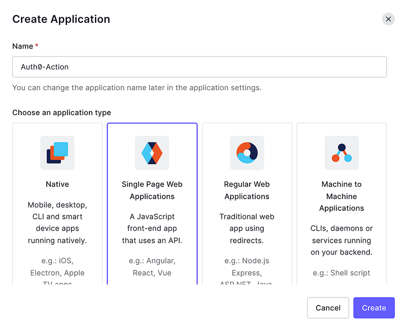 2. In the modal that follows, add the name of the application and then select Single Page Web Applications as its type.