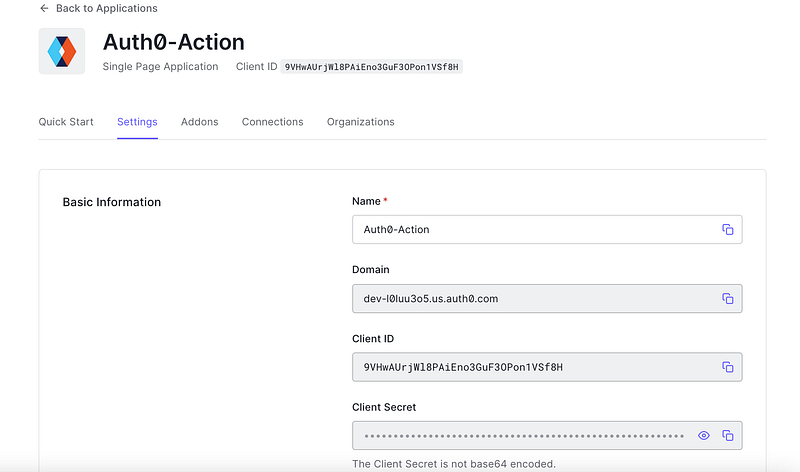 5. Click on the Setting tab to change the configuration of your Auth0 application. We’ll also be borrowing some data from this tab, precisely the Domain, and Client ID. I won’t be covering the theory of different URLs and origins but if you are interested in reading more about them, refer to this similar article that I drafted a while back.