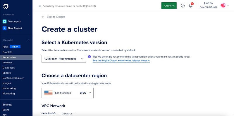 Over DigitalOcean, Kubernetes Clusters can be created in many ways, using the Dashboard, doctl CLI and so on. I used the DigitalOcean Dashboard to create it, specifically the Kubernetes Create Cluster Dashboard. Here are the specifications that I used: